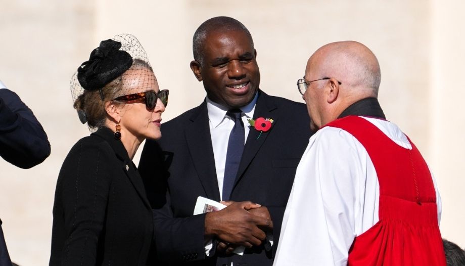 David Lammy, viceprimer ministro del Reino Unido (centro), y el arzobispo anglicano Stephen Cottrell de York, asistieron a la Misa del papa León XIV en la Plaza de San Pedro del Vaticano el 1 de noviembre de 2025 (Foto CNS/Lola Gómez).