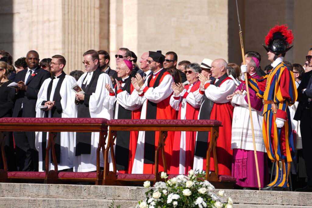 Representantes anglicanos y ecuménicos aplauden después de que el Papa León XIV declarara a San John Henry Newman ‘Doctor de la Iglesia’, durante la Misa de clausura del Jubileo educativo en la Plaza de San Pedro del Vaticano, el 1 de noviembre de 2025. (Foto CNS/Lola Gómez).