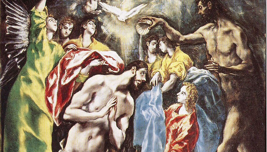El Bautismo de Jesús inaugura en la Tierra la vida del Cielo, al igual que El Greco representa los ámbitos terreno y celeste. Es el don de una vida nueva, la vida que inaugura Jesús en su Pascua (anunciada y contenida en su Bautismo ante Juan) y que traslada al ser humano hacia la bendición y la benevolencia del Padre en los Cielos. De ahí que los Cielos abiertos, que brillan en los espléndidos azules y amarillos del cuadro, expresen que el Bautismo es la Puerta para la vida eterna y la puerta para todos los demás sacramentos, que nos traen a la Tierra al Dios de los Cielos.