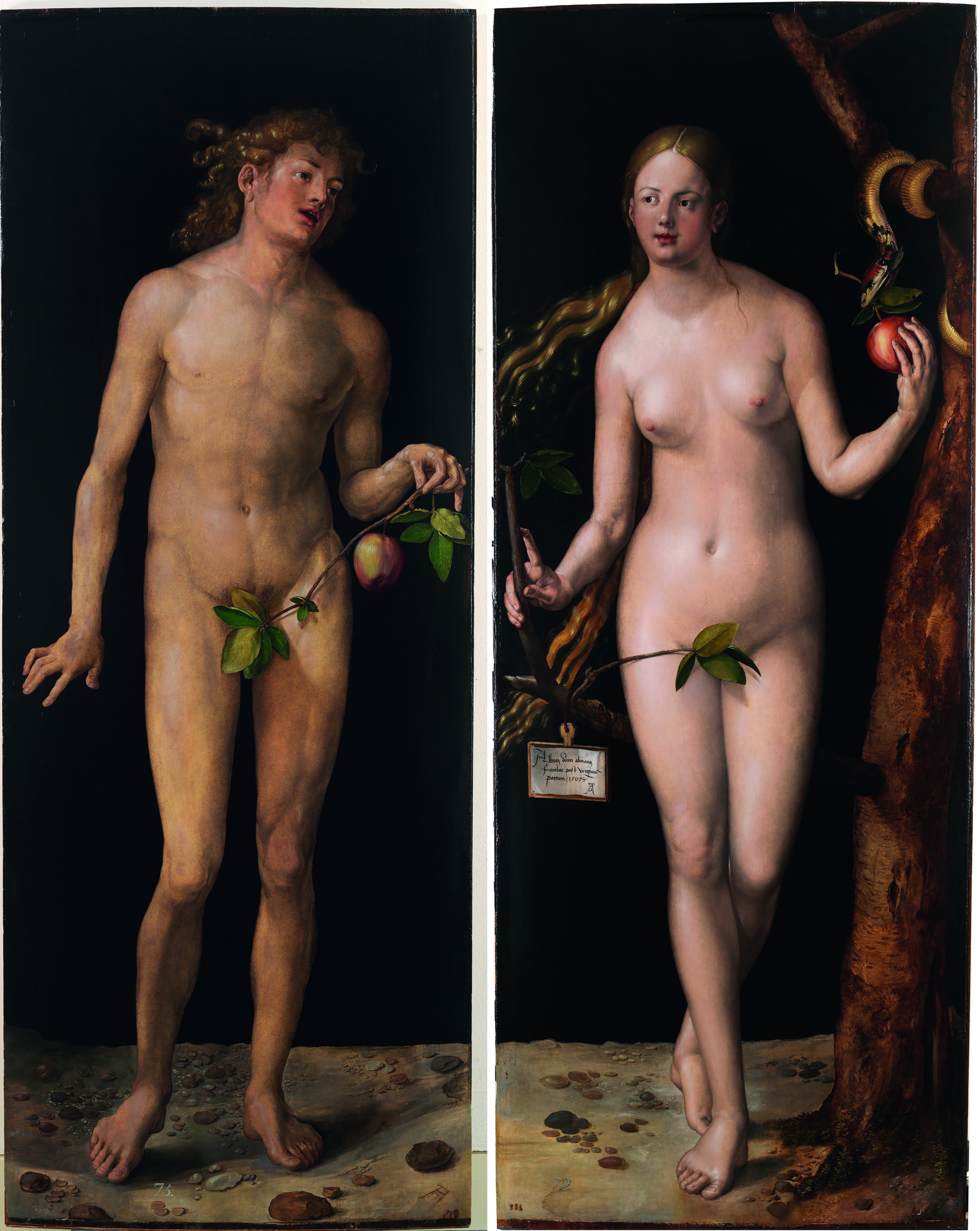 Dios creó al hombre y la mujer como culminación de la creación, el toque final. Las figuras de Adán y Eva, representadas aquí a tamaño natural, nos transportan al paraíso, y nos recuerdan la perfección del mismo antes de que el pecado original tuviera lugar. El fondo uniforme de color negro y la línea del horizonte muy baja, realzan la belleza y elegancia de los cuerpos, asegurando que nuestra atención se centre en las figuras. Son dos obras magistrales que encapsulan los ideales del humanismo renacentista y la destreza técnica de Durero.