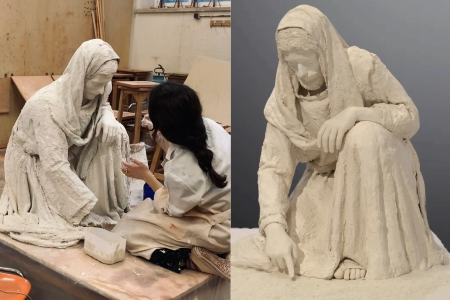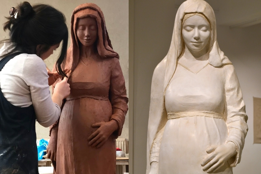 La Virgen embarazada de Elena esconde una historia peculiar. Representar a una Virgen en el mundo de hoy es ir completamente a contracorriente. Y más en una universidad como la Complutense. Elena la esculpió como parte de su Trabajo de Fin de Grado y afirma que optar por el arte sacro en ese contexto fue, en cierto modo, «una manera de evangelizar en silencio».