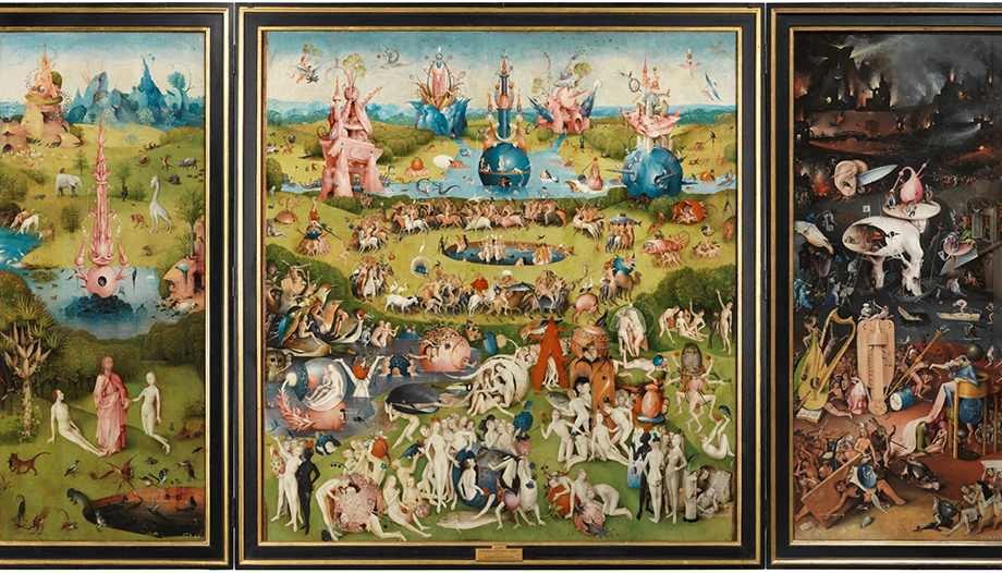 El Tríptico del Jardín de las Delicias está formado por tres paneles de roble. Las dos alas se pliegan sobre el panel central, continuación del paisaje del Jardín del Edén. Los colores brillantes de esta composición contrastan notablemente con el panel derecho que representa el infierno. Cuando el tríptico está cerrado, todo lo que vemos es una representación en grisalla de la creación del mundo (analizado previamente).