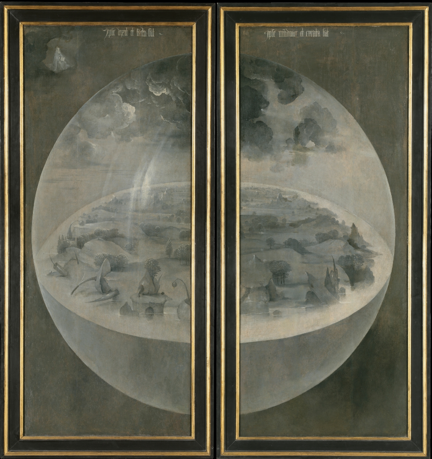 El tríptico cerrado muestra la visión de El Bosco del final del tercer día de la creación: una esfera cristalina flotando en las tinieblas; la luz y la oscuridad son los causantes de la tonalidad grisácea que nos revela árboles y vegetación brotando a la vida, dispersos en el paisaje.