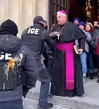 The scene in the video shared on Instagram is fraught with tension: U.S. immigration agents wearing bulletproof vests and masks, some of them with egg splatter, are confronted by a silver-haired Catholic bishop on the steps of a gothic-looking church.