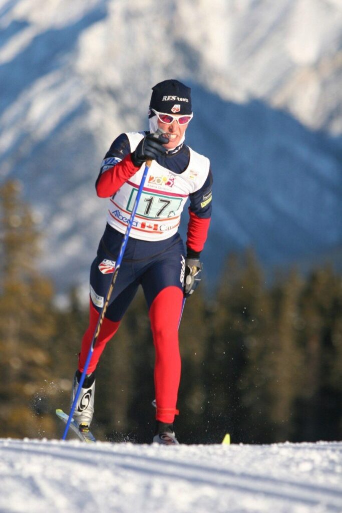 Rebecca Dussault scia durante l'Alberta Centennial World Cup a Canmore, Alberta, nel dicembre 2005. Vent'anni fa, la fondista e devota cattolica ha partecipato alle Olimpiadi invernali di Torino (foto OSV News/corriere di Sharbel Dussault).
